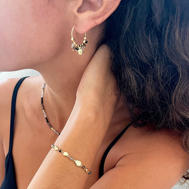 Sofia Small Hoop Nugget Earrings Labradorite, Black Onyx & Smoky Quartz