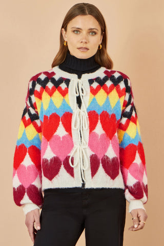 - Yumi Multicolour Tie Front Heart Intarsia Cardigan