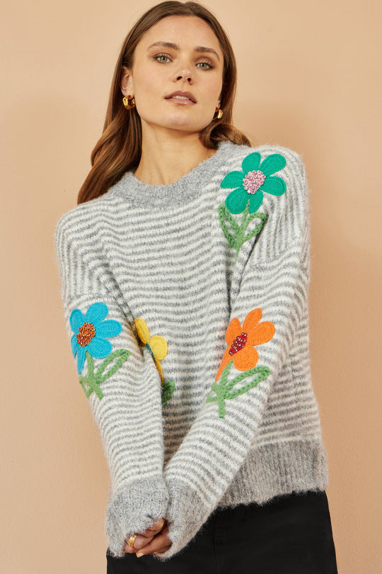 Yumi Grey Striped Relaxed Fit Jumper With Flowers