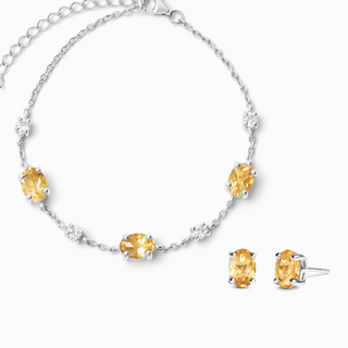 The perfect starter set for yellow gemstone lovers, this jewellery set comprises a bracelet and a pair of matching stud earrings. Each piece has been meticulously handcrafted with citrine - the golden yellow gemstone. The bracelet is also adorned with sparkly simulated diamonds. This jewellery set will make the perfect Christmas gift, birthday gift and anniversary gift for your loved ones.