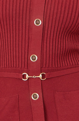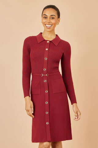 - Yumi Burgundy Rib Knit Midi Shirt Dress With Snaffle Belt
