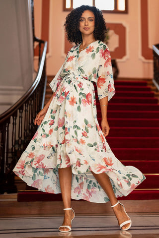 This elegant floral dress brings a fresh, romantic charm to any occasion. Designed with a soft ivory base, it features a vibrant print of blooming flowers and butterflies that add movement and colour. The wrap-style bodice, flutter sleeves, and tie-waist create a flattering silhouette, while the high-low hem adds graceful flow with every step. Perfect for garden parties, special events, or daytime outings.