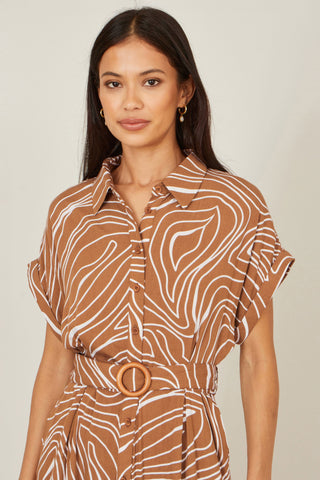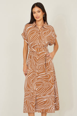 - Yumi Brown Abstract Swirl Print Relaxed Midi Shirt Dress With Belt