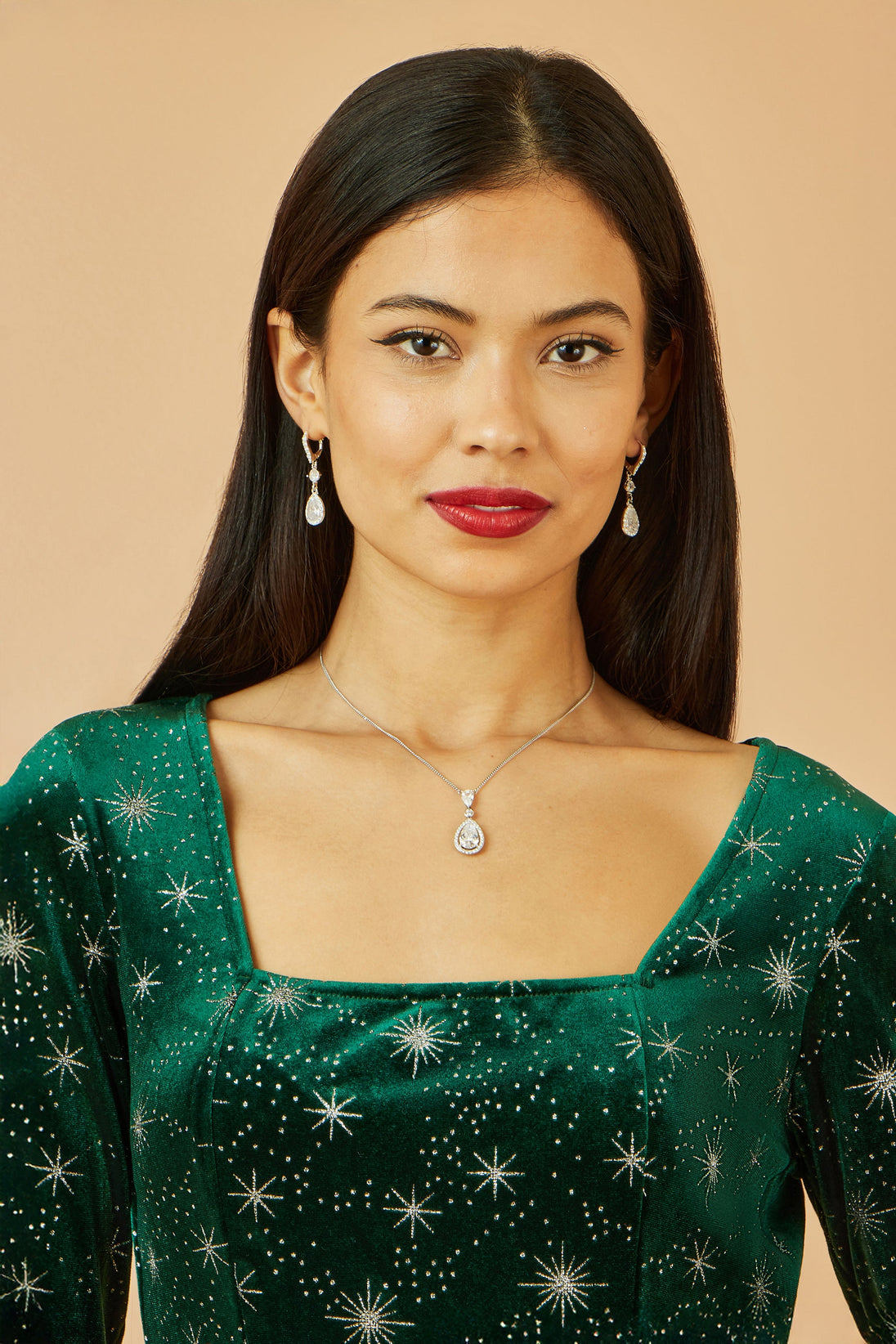 Capture the beauty of the night sky in this Green long sleeve skater dress from Yumi. With a square neckline, fit flare shape and stunning velour fabric that is not only glamorous but super soft too. The all over constellation print is a unique take on sparkles for the festive season and would look great at your Christmas party styles with silver shoes and accessories.