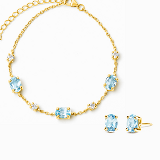 The perfect starter set for blue gemstone lovers, this jewellery set comprises a bracelet and a pair of matching stud earrings. Each piece has been meticulously handcrafted with sky blue topaz - the light blue gemstone. The bracelet is also adorned with sparkly simulated diamonds. This jewellery set will make the perfect Christmas gift, birthday gift and anniversary gift for your loved ones.