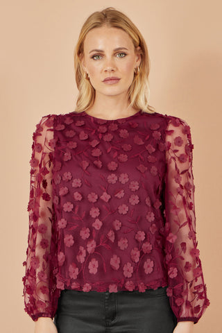- Yumi Burgundy Sheer Sleeve Applique Flower Top