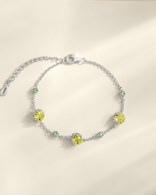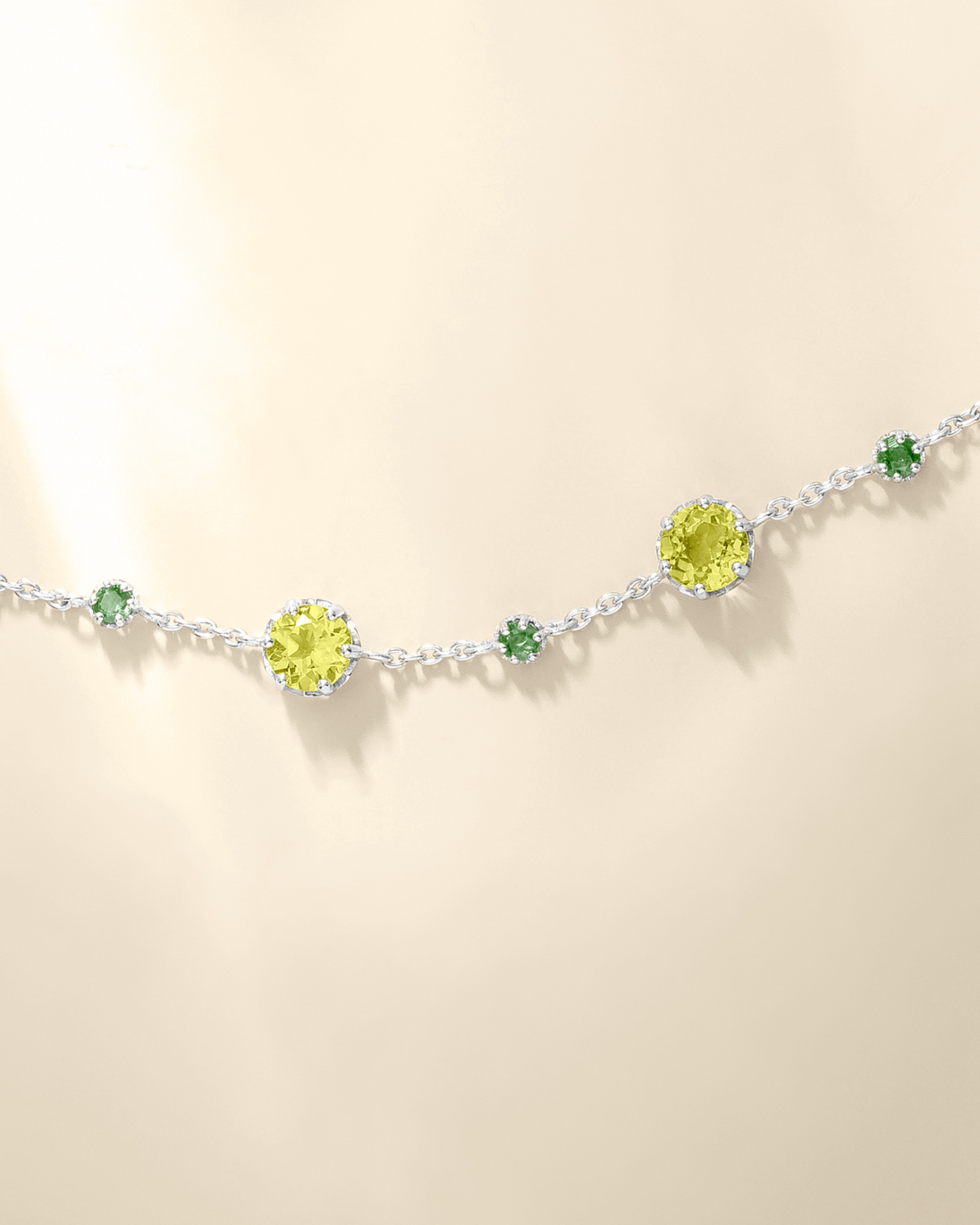 This stunning bracelet features natural emeralds and peridot, creating a gorgeous colour combination in two shades of green. The gemtones are set on the uniquely designed petal prongs, adding beautiful hidden details on the bracelet. It is the perfect accessory for adding sparkle to your outfit and will also make a great gift for your loved ones.