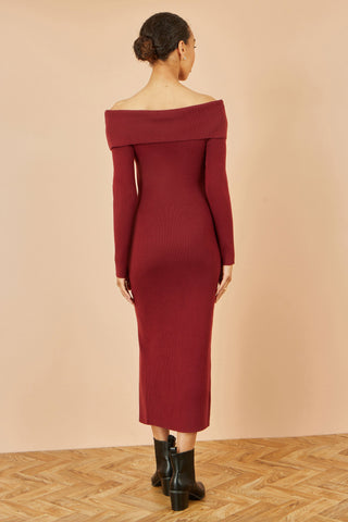 - Yumi Burgundy Bardot Knitted Fitted Midi Dress