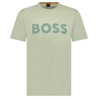 Upgrade your everyday essentials with the BOSS Thinking 1 Logo T-Shirt in Green. Crafted from 100% cotton, this premium tee offers a soft and breathable feel, ensuring all-day comfort. Designed in a regular fit, it features a ribbed crew neckline, short sleeves, and a straight hemline for a clean and versatile look. The signature BOSS logo is printed on the chest, adding a refined touch to this wardrobe staple.
