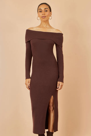 - Yumi Brown Bardot Knitted Fitted Midi Dress